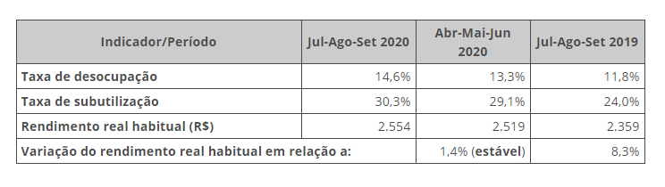 Na comparação com o trimestre anterior, a taxa de desocupação subiu em dez estados e ficou estável nos demais. As maiores taxas foram na Bahia (20,7%), em Sergipe (20,3%) e em Alagoas (20,0%). Já a menor foi registrada em Santa Catarina (6,6%).
